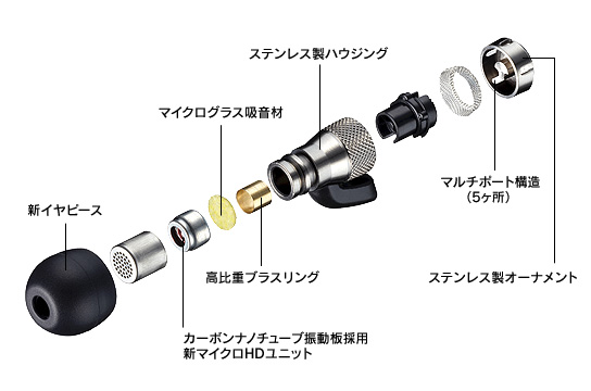 HA-FXD80の分解図。高剛性ステンレス素材を切削加工した「メタルエンクロージャー」に、比重の大きいブラスリングを内蔵した「デュアルシリンダー構造」を採用。不要な振動を抑え、臨場感の高いサウンドを再生する