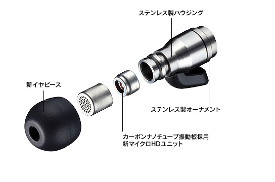 HA-FXD70の分解図。本機もステンレス製のハウジングを採用したほか、カーボンナノチューブ振動板採用の新マイクロHDユニットを搭載している