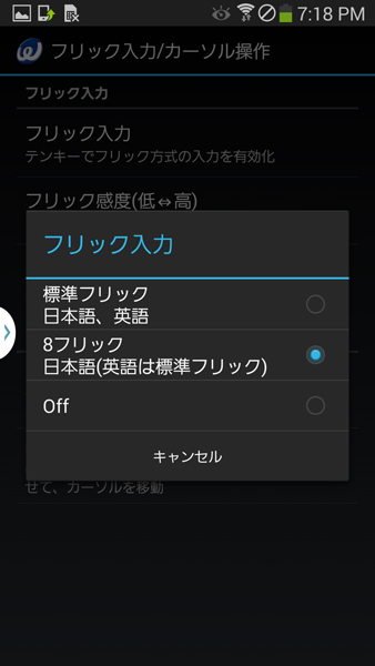 フリック入力のメニュー選択画面。8フリックと標準フリックが選択可能