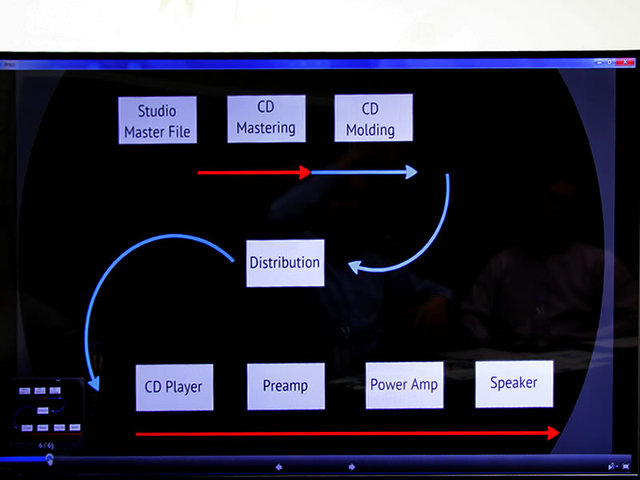 音楽信号の伝送経路イメージ図。赤い矢印が何らかの情報欠落が起こる伝送方法で青い矢印は情報量を保ったままの伝送を表している。CDではマスタリングの際にダウンサンプリングされ、再生のD/A変換でも情報の欠落が起こると説明