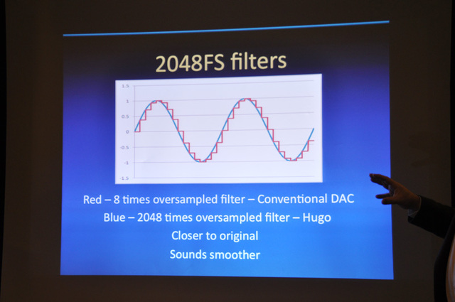 Hugoの製品発表会にて掲示された資料。タップ数(処理精度)を可能なかぎり増やすことを実現したことで、ジッターやノイズフロアを極限まで抑制した原音に近い波形を獲得した