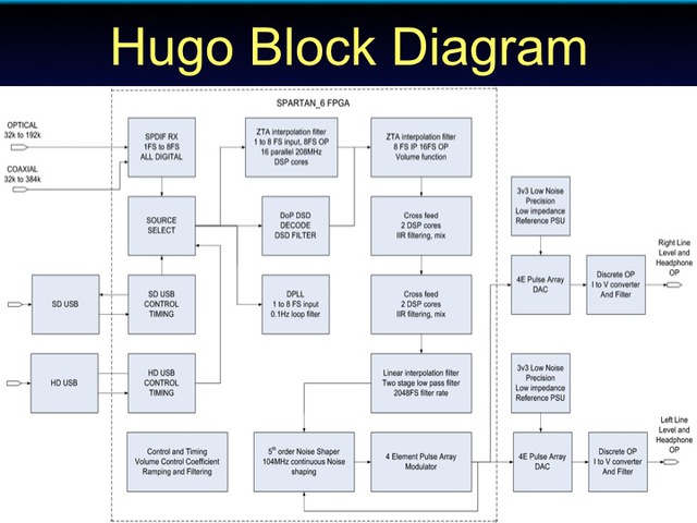 Hugoのブロックダイヤグラム。ほとんどのデジタル処理がワッツ氏の手により組み上げられたFPGAで行われている。2048倍のオーバーサンプリングによってジッターやノイズフロアを極限まで抑制した上で、CHORDの代名詞であるパルスアレイDACへと送り込まれる構成だ