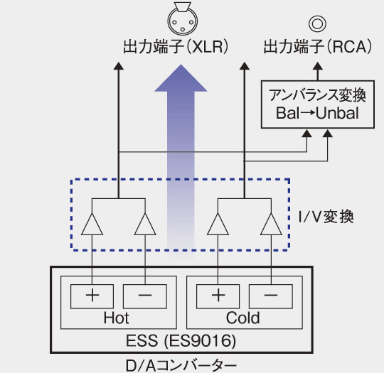 フルバランス伝送の概念図。I/V変換回路を含むD/Aコンバーター以降の全段をフルバランス構成としている