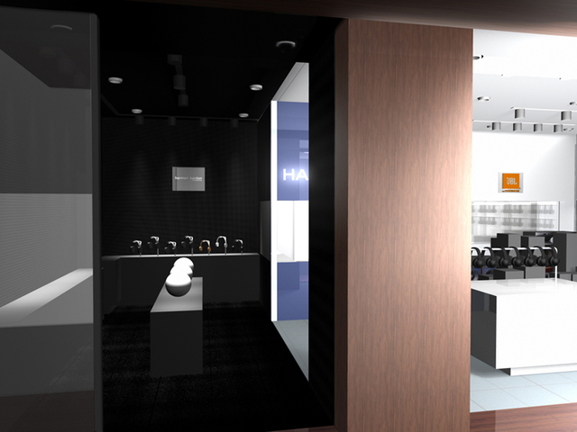 ストアのエントランス。harman/kardonの商品が落ち着いた雰囲気の明かりで照らし出される(完成前のイメージ図です)