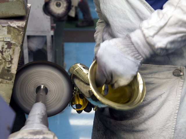形ができあがったら、徹底的に磨き上げていく。レースのような生地を束ねたバフで部位や工程に応じて、数種類の研磨剤を使い分けて磨いていく。この後、塗装、組み立て工程に入る