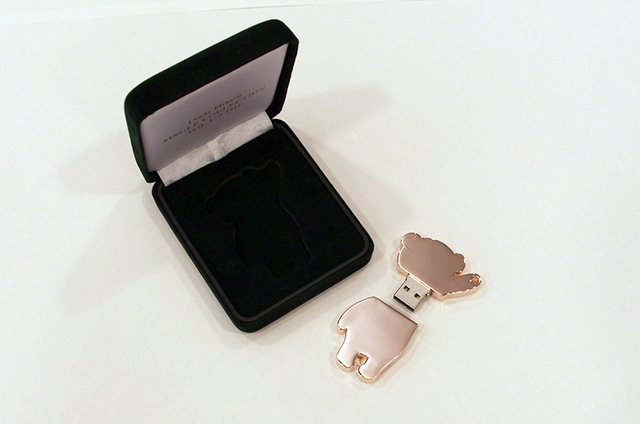本人のデザインによる「くまちゃん」イラストをモチーフにしたオリジナルUSBメモリにハイレゾ音源が収められている。継ぎ目のない金属モールド加工で表面は艶やか。手にするとずっしりとした質感がある。くまちゃんの上半身をPCに挿す。「この様子、ちょっとおかしいでしょ(笑)?」(沖田氏)