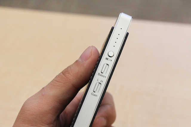 側面部にはモバイルバッテリーのオン/オフボタン、ゲインとバスブーストの切り替えスイッチを備える