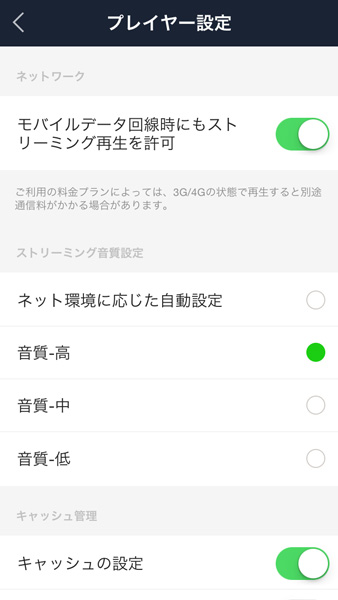 LINE MUSICのストリーミング音質は最高品質の320kbpsから、中・192kbps、低・64kbpsより選べる