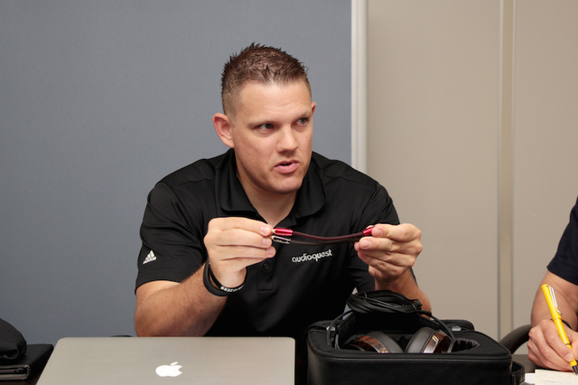 近々発売予定の3.5mm-3.5mmのアナログケーブルの説明をしているShaun Schuetz氏