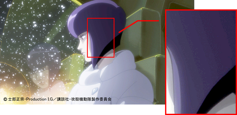 SBMV Extendをかける前の場面。主人公・素子が使うデコットの髪の部分にバンドノイズが発生してしまっている事に加え、髪の影が周囲から浮いている