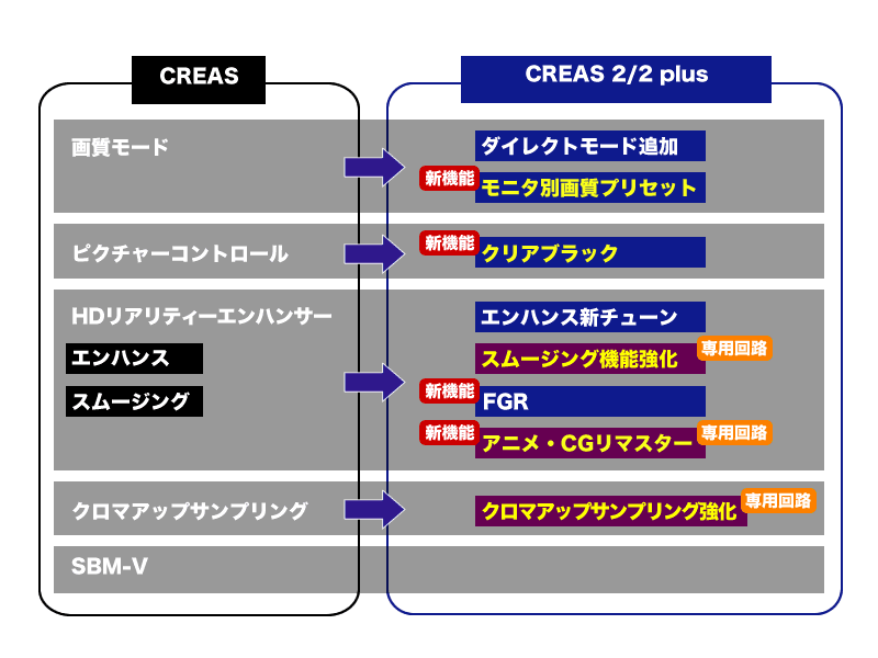 高画質回路「CREAS」が進化したポイント。ブルーのアイコンが「CREAS 2」の、紫のアイコンが「CREAS 2 plus」の新機能となる