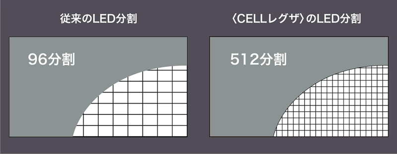 LEDブロックアレイはクラス最高の「512分割」とし、表示される映像の明暗差をよりきめ細かく制御することで豊かな表現力を実現している