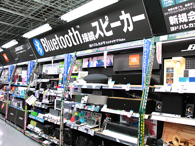 ヨドバシカメラ マルチメディアAkibaの4階オーディオコーナー。Bluetoothスピーカーの展示が大きくフィーチャーされている
