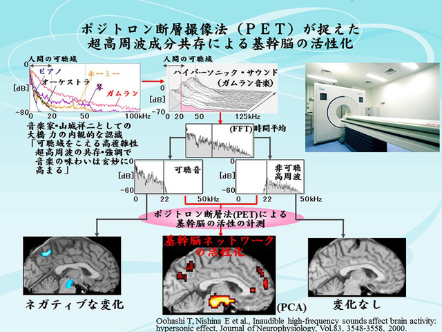 可聴帯域内の音と超高周波を同時に聴くと脳が活性化されることが、PETによる測定で分かったという