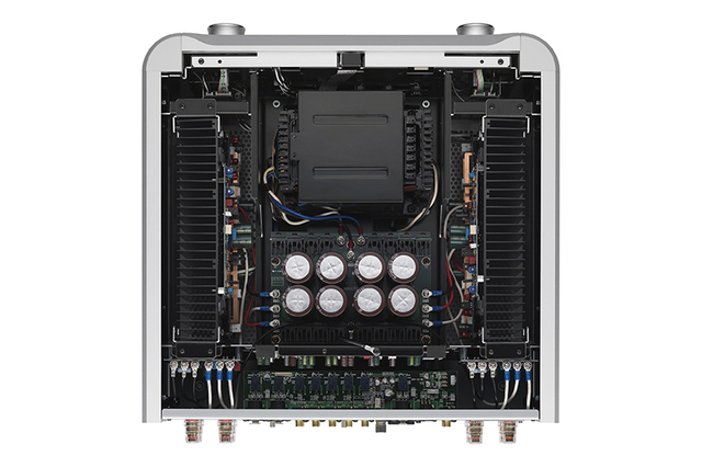 F-03Aの内部構造。プリ部とパワーアンプ入力段など見事に左右対称に配置され、パーツ等ぎっしり詰め込まれているのが分かる。セパレートの思想を一体型につぎ込むのに相当の苦労があったという