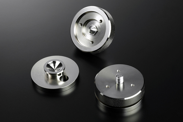 重量級のボディの振動対策を徹底させるに、F-03Aはピンポイントフット(左)、F-05はスチールの製のインシュレーター(右)を採用し、4点で支持を行っている