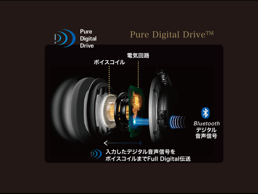 ワイヤレスで届いたデジタル信号を「Dnote」技術でデジタルのままボイスコイルに伝え、専用設計のドライバーを駆動して音を鳴らす「ピュア・デジタル・ドライブ」を採用