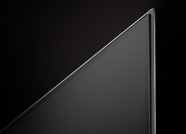 バックライトが存在しない有機ELテレビは横から見ても美しい。強化ガラスの触感も独特だと市川氏は力説する