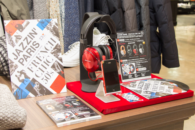小田急百貨店新宿店の23区オムの店頭で展開されている『JAZZIN' PARIS FRENCH CHIC 50's』の模様。パイオニアのヘッドホン「SE-MS5T」で、キャンペーンのために選曲された20曲のジャズを試聴することができる