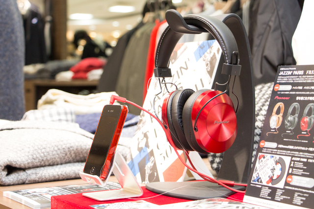 小田急百貨店新宿店の23区HOMMEの店頭で展開されている『JAZZIN' PARIS FRENCH CHIC 50's』の模様。パイオニアのヘッドホン「SE-MS5T」で、キャンペーンのために選曲された20曲のジャズを試聴することができる