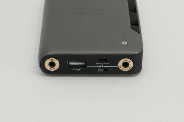 本体底部にはφ3.5mmステレオミニ/丸型光TOSに対応した入力端子と、φ3.5mmステレオミニによるライン出力、USB入力や充電用のUSB A端子を装備