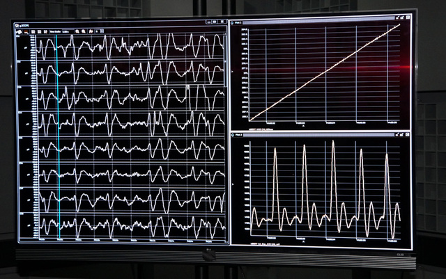 64個のセンサーから8つの脳波をピックアップ。心拍の変化と同一の画面でモニタリングしている