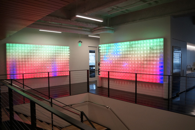 オフィスの廊下や階段のスペースも悠々としている。アーティスティックなインスタレーションのセンスもいい