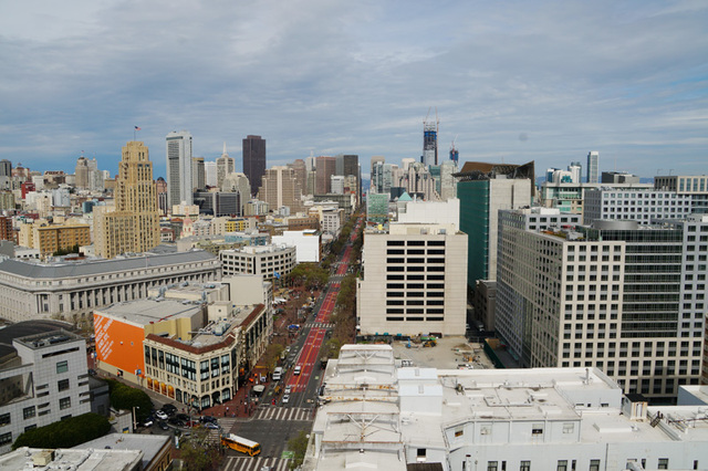 16階立てのビルのテラスから、サンフランシスコの街並みを見下ろす