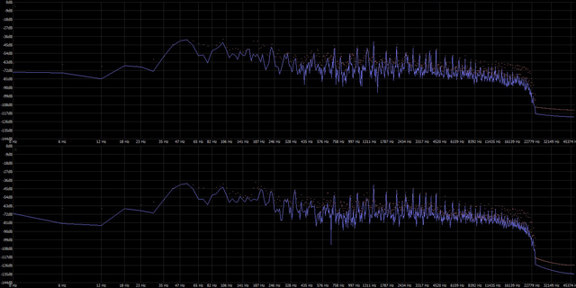 今回特別に用意していただいた、アイマス楽曲のオリジナルマスター(48kHz/24bit・左)と、ORTマスタリング後(96kHz/24bit・右)の周波数特性。帯域が広がっていることが見て取れる