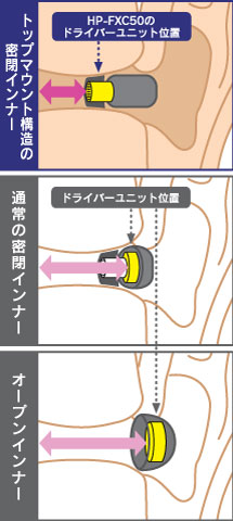 通常の密閉インナーイヤーとオープンインナーイヤーのヘッドホンと比較した、トップマウント構造の装着イメージ