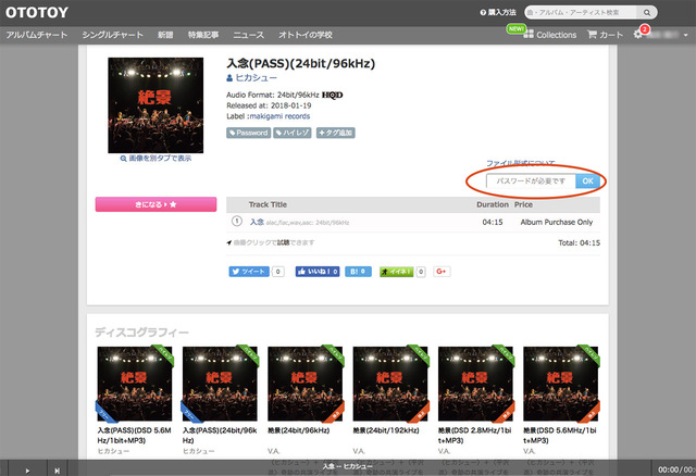 HOME > インタビュー > 記事 無料ダウンロードキャンペーンもスタート 従来とは異なるストリーミング音楽配信「OTOTOY Collections」。その魅力を竹中直純氏が語る 海上 忍 2018年02月06日 前の写真へ 次の写真へ こちらがパスワードの入力画面。赤丸のところに「0119」と入力しチェックアウトする 前の写真へ 次の写真へ この写真の記事へ 関連リンク OTOTOY