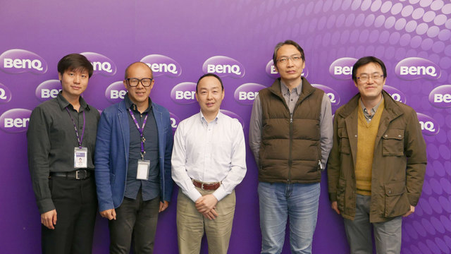 今回お話しをお伺いしたBenQの面々。正面左より、プロジェクター製品プロダクトマネージャーRay YJ Tsai氏、技術管理マネージャーEric HC Tsai氏、筆者の鴻池賢三氏(中央)、ライフスタイルデザインセンターPaul Zhu氏、同Wayne CC Chen氏