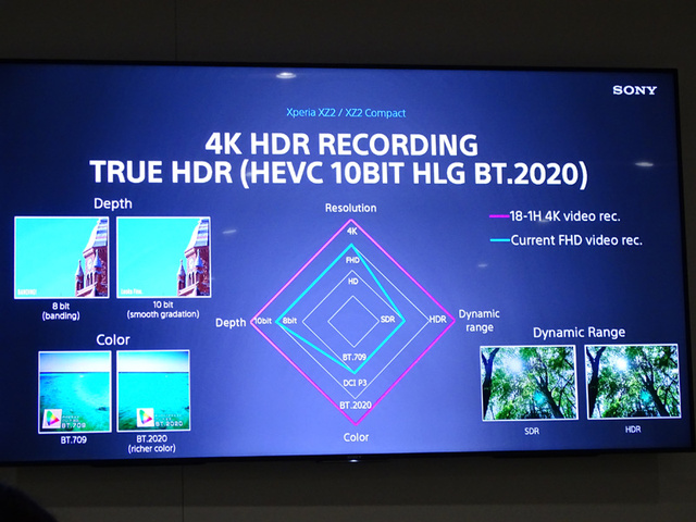 XZ2はスマホとして世界で初めて4K/HDR動画の単独撮影が可能。一瞬で露出の異なる2枚の静止画を撮影。合成して高精細な写真を生成する