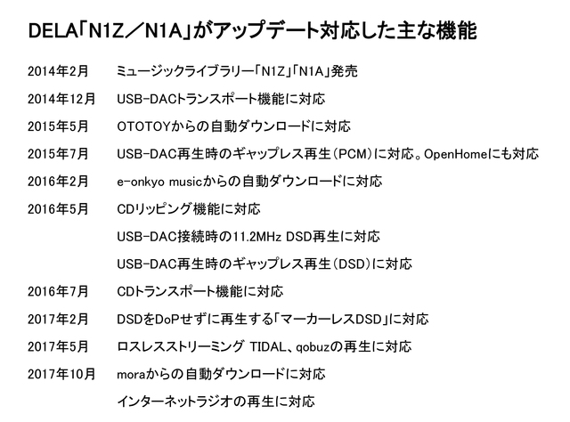 N1Z/N1Aはアップデートによる機能追加によって、オーディオ専用NASというコンセプトさえ拡張していった。追加機能の一覧をふり返るとそれがよくわかる ※作成:PHILE WEB編集部
