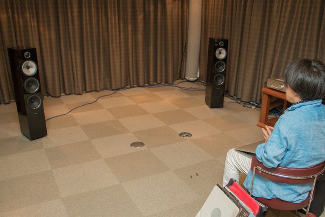 インタビューに先立ち、持参したLPでDP-400を試聴する土方氏
