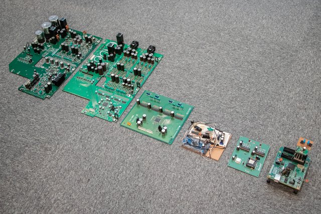 SA-10/SA-12のMMM-Conversionに至るD/A変換基板の試作機の流れ。右から左へ、時系列で試作基板が並べられている。一番左側がSA-12に実際に搭載されたMMM-Conversionを含むアナログオーディオ基板だ