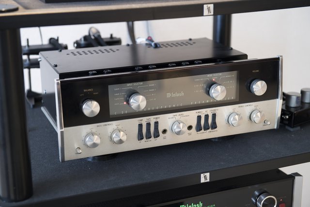 もうひとつの要、マッキントッシュのプリアンプ「C22」。本来木箱に入っていたが、木箱から取りだしたほうが音がよかったために現在のようなかたちになっているという