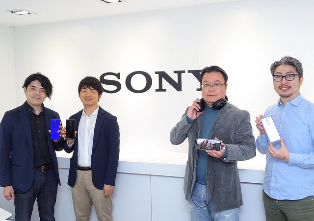 MWC19の会場でソニーモバイルコミュニケーションズが発表した「Xperia 1」の開発チームを訪ねた。左からディスプレイ担当の松原直樹氏、商品企画担当の都築辰弥氏、オーディオ担当の松本賢一氏、カメラ担当の間下健介氏