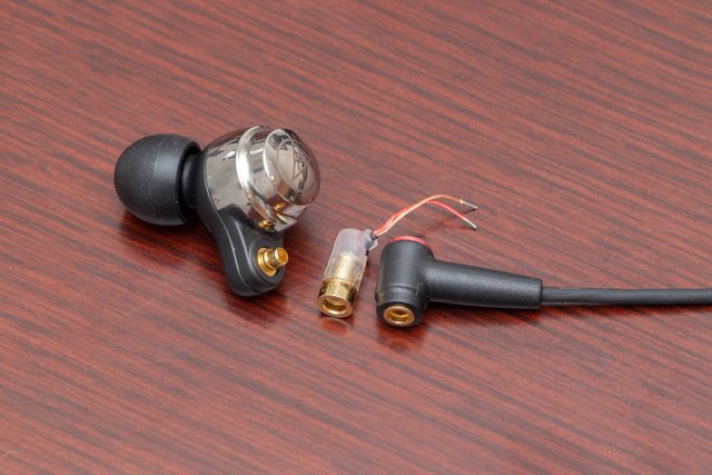 写真右がATH-CK100PROのMMCX端子(メス側)。写真中央がA2DC端子(メス側)。端子のサイズのちがいがわかるだろう