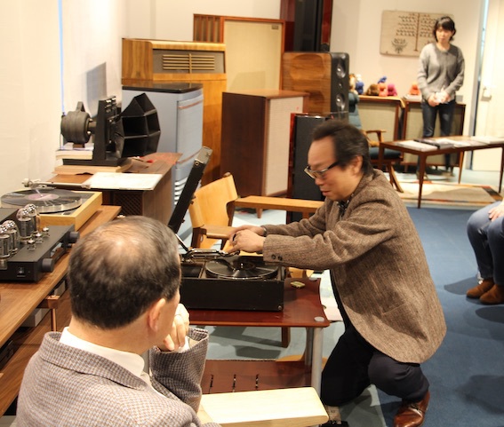 グラモフォンHMV102でSPレコードを再生する黒崎氏