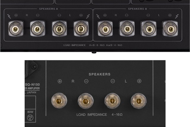 アンプ側は、写真上のようにA+Bのスピーカーターミナルを備えているモデルで、トゥイーター用とウーファー用をAとBで分けて接続できるのはもちろん、写真下のようにスピーカーターミナルがひとつしかないモデルでも、トゥイーター用とウーファー用を両方接続して使用する方法でも問題ない