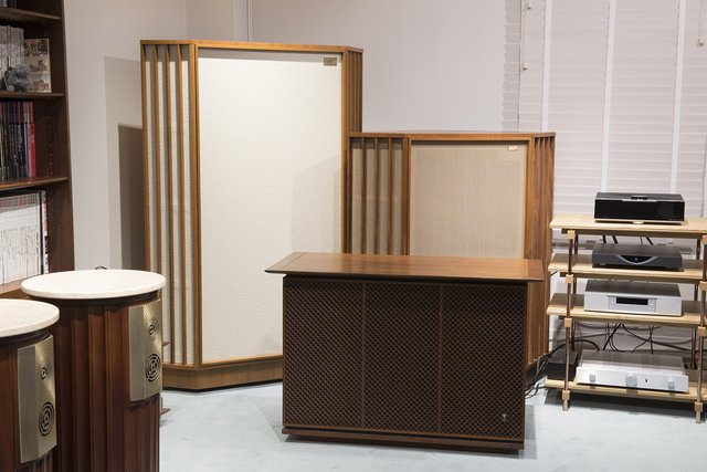 TANNOYのオートグラフにGRF(奥)やエンパイアのスピーカー(左手前)などお宝ずらり。基本的に改造などはしないが、左右の音圧や内部の吸音材を整えるなど、細かなメンテナンスを行なっている