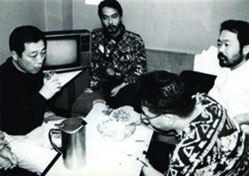 ピットインの楽屋で気の知れたメンバーとくつろぐ森山さん(1991年)