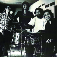 「FLUSH UP」のライナーノートの裏にある写真。左より板橋文夫(P)、高橋知己(Sax)、望月英明(B)、森山威男(Ds)。当時の若々しいメンバーの姿を見ることができる