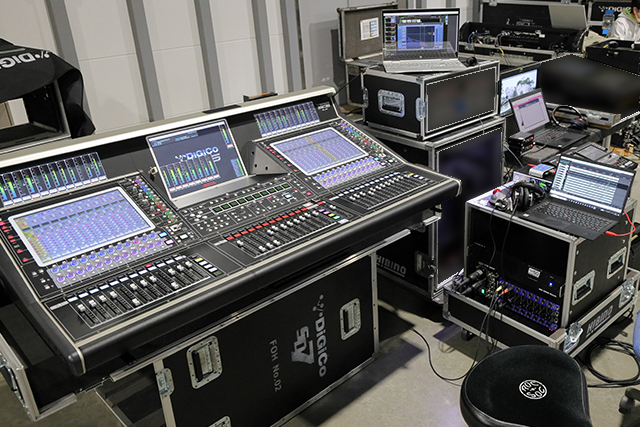 ライブ会場で配信用ミックスを行うことを想定したシステム。手前がミックスを行うミキシング・コンソールで、奥にあるのがミックスした音と映像を合わせ、実際に配信を行う機材一式