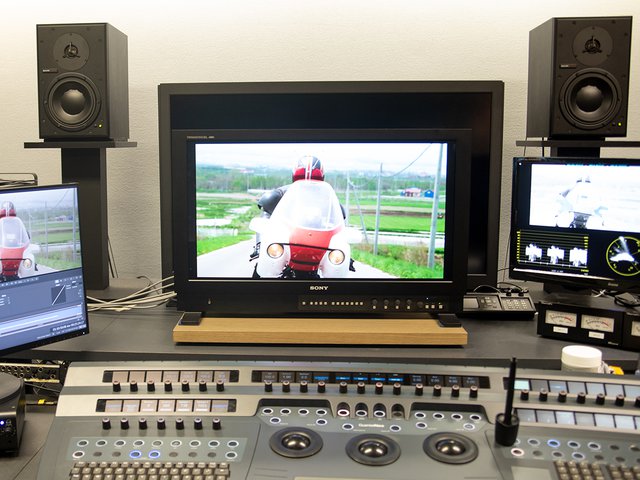 カラーコレクション時にマスターモニターとして使われるSONY「BVM-X300」。モニタースピーカーとして設置されているのはDynaudio「BM6A」