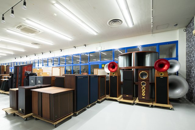 同社内にストックされている買取品の数々。スピーカーやアンプ、プレーヤーなど、さまざまなオーディオ機器を3,000点近くストックしているという