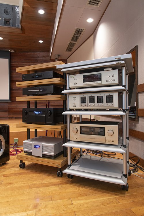 ECLIPSEスピーカーの開発拠点「スタジオフォルテ」に設置されたTAOCのオーディオラック。右が中核ラインのASRVシリーズで、左が最高峰のCSRシリーズ