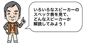 これはまたのちほど解説するとして、その次に「出力音圧レベル」「周波数特性」「クロスオーバー周波数」「入力インピーダンス」「許容入力」といった用語が、データ付きで示されていますね。これがカギになるスペック値です。