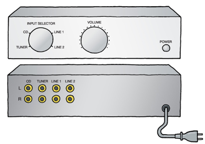 最初にくるのが入力セレクター。もしCDプレーヤーだけし接続しないのであれば、ソースの切り替えなんて必要ないわけですが、そうはいきません。FMやアナログのLPレコードも聴きたい。テープやMD、さらにAUX(外部入力端子)につないだ他の機器の音も聴きたいとなると、それらを選択する機能が欠かせませんね。入力ソースの交通整理をするのが入力セレクターというわけです。次にプリアンプ部のボリューム(音量調整)やトーンコントロールなどの音質調整を経て、、パワーアンプで電力増幅され、スピーカーを鳴らすという手順になります。
